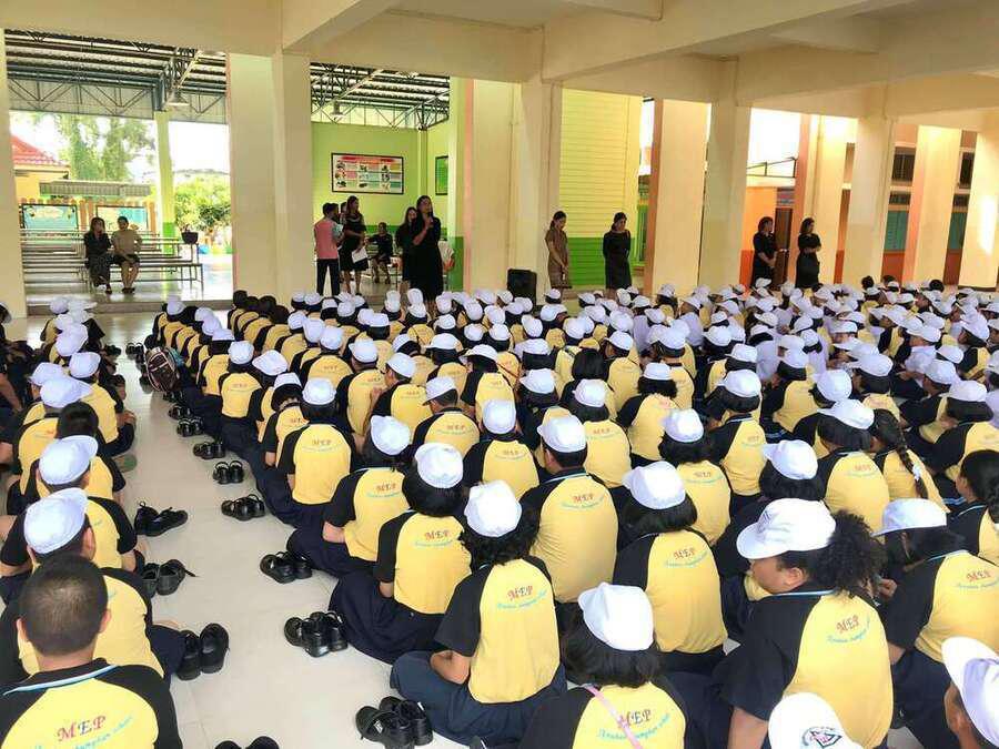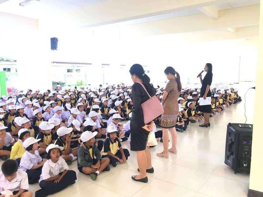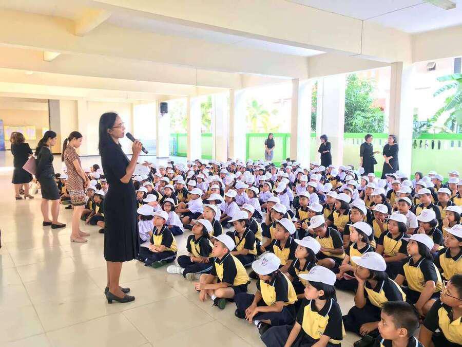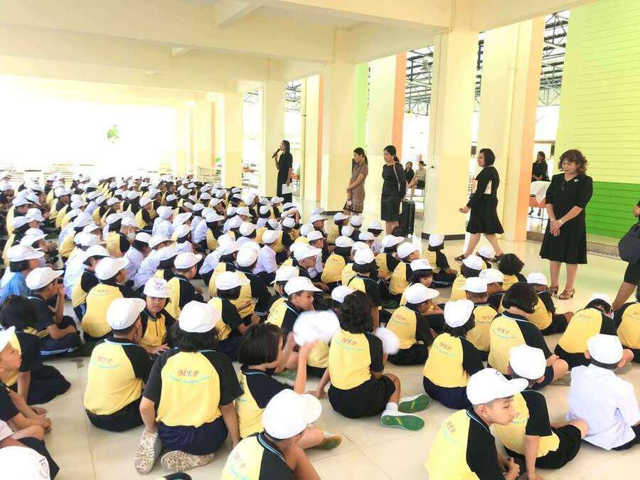 นางสุทาทิพย์ สุขวิสุทธิ์ หัวหน้าโครงการ Mini English Program โรงเรียนอนุบาลชุมพรพร้อมคณะครู ในโครงการ ประชุมทำความเข้าใจกับนักเรียนในโครงการ