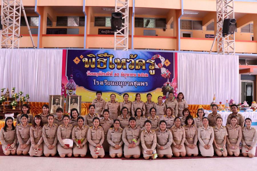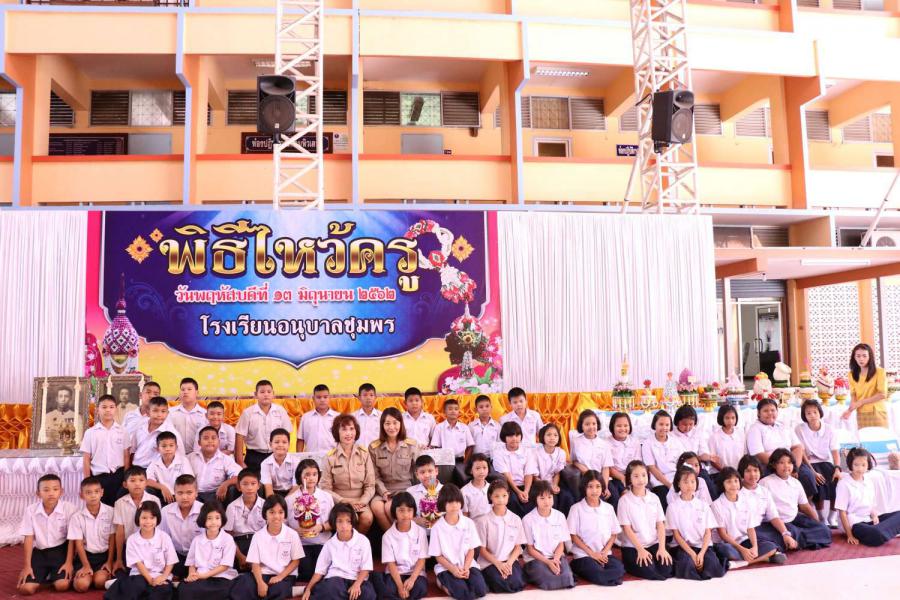 โรงเรียนอนุบาลชุมพรได้จัดกิจกรรมวันไหว้ครูประจำปีการศึกษา 2562 วันพฤหัสบดีที่ 13 มิถุนายน 2562 เพื่อแสดงความเคารพ ยอมรับนับถือครูบาอาจารย์อย่างจริงใจ ซึ่งการไหว้ครูนี้ นอกจากจะเป็นธรรมเนียมอันดีงามที่มีส่วนโน้มน้าวจิตใจคนให้รักษาคุณความดี และช่วยธำรงรักษาวิทยาการให้สืบเนื่องต่อไปแล้ว การที่ศิษย์แสดงความเคารพยอมรับนับถือครูตั้งแต่เบื้องต้น ก็มีส่วนทำให้ครูเกิดความรัก ความเมตตาต่อศิษย์ อยากมอบวิชาความรู้ให้อย่างเต็มที่ และศิษย์เองก็จะมีความรู้สึกผูกพันใกล้ชิด เกิดมั่นใจว่าตนจะมีผู้คุ้มครองดูแล สั่งสอนให้ไปสู่หนทางแห่งความดีงาม และความเจริญก้าวหน้าแน่นอน ทั้งนี้ผู้อำนวยการโรงเรียนอนุบาลชุมพรอนายศักดิ์สิทธิื แร่ทองได้มอบเกียรติบัตรให้แก่นักเรียนที่ได้เข้าร่วมประกวดการทำพานไหว้ครู S:0