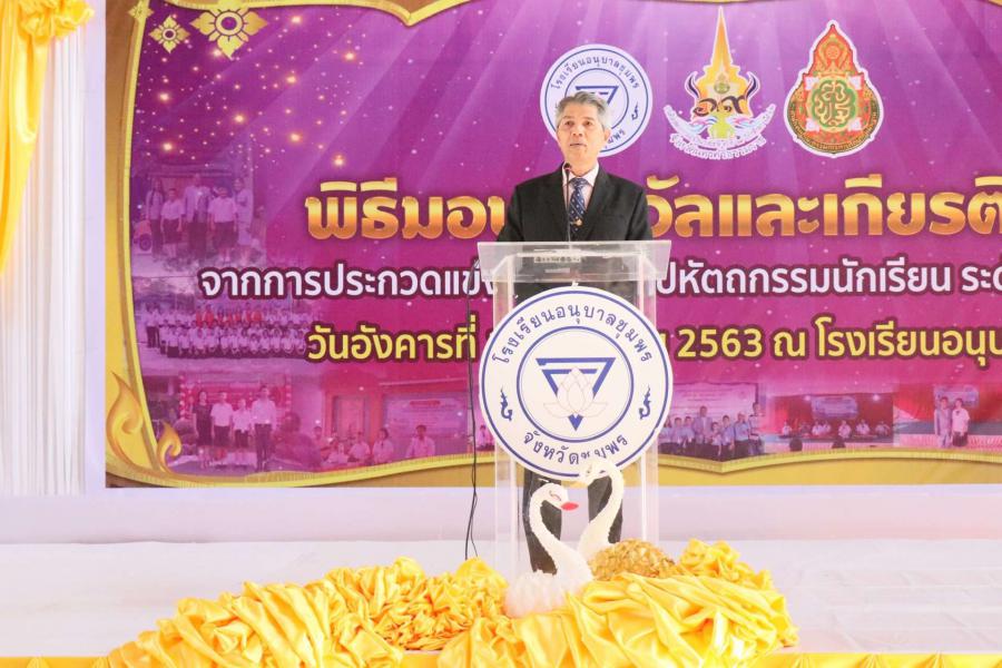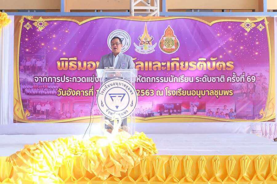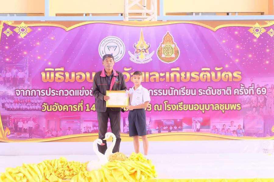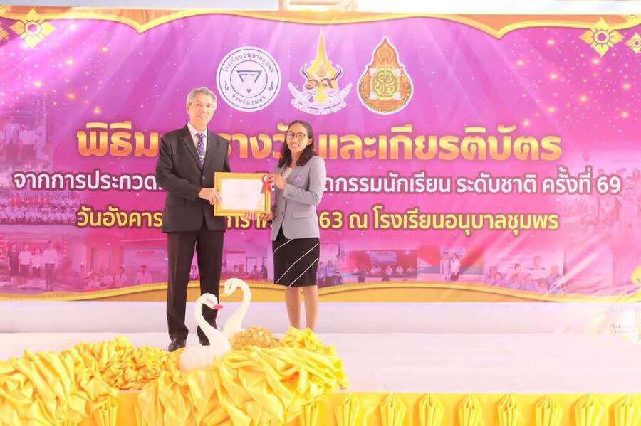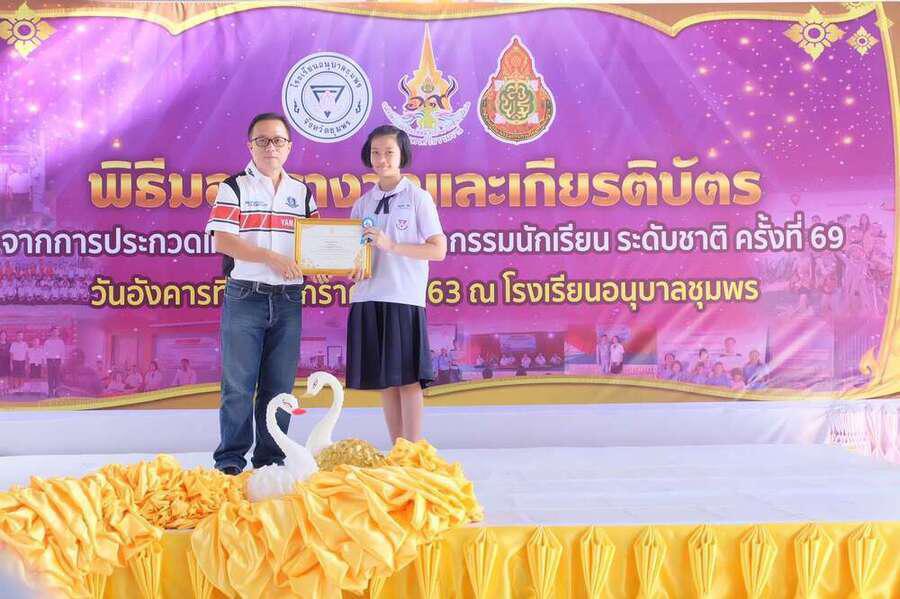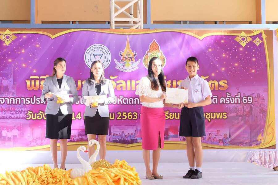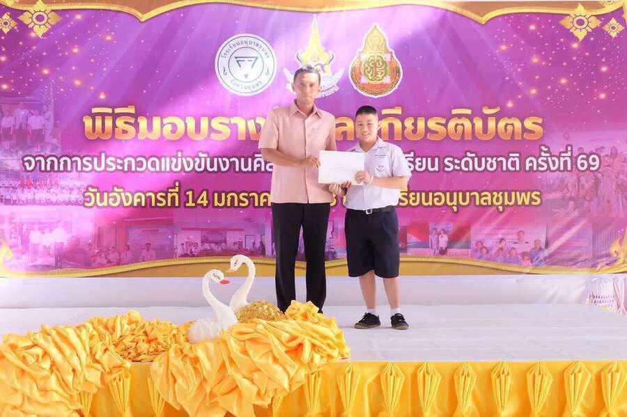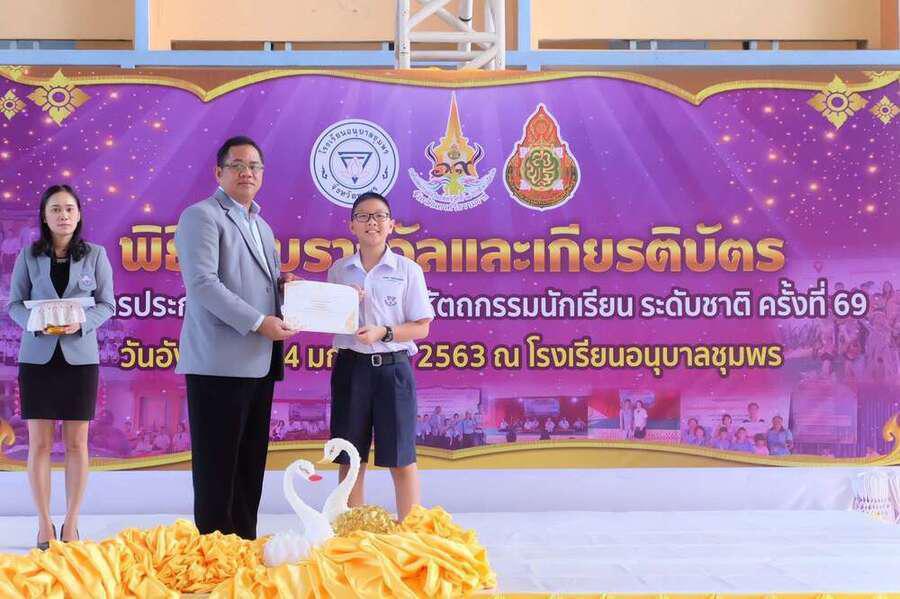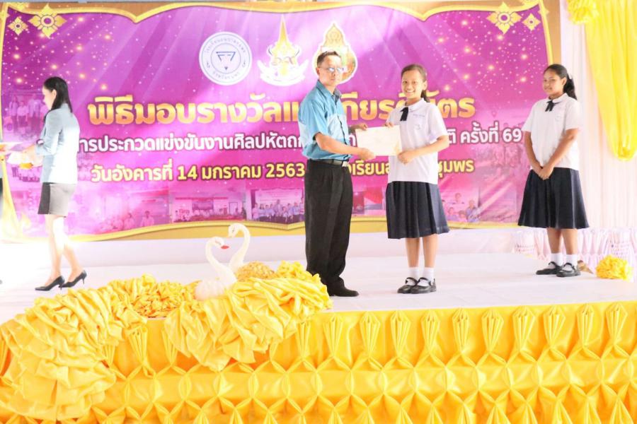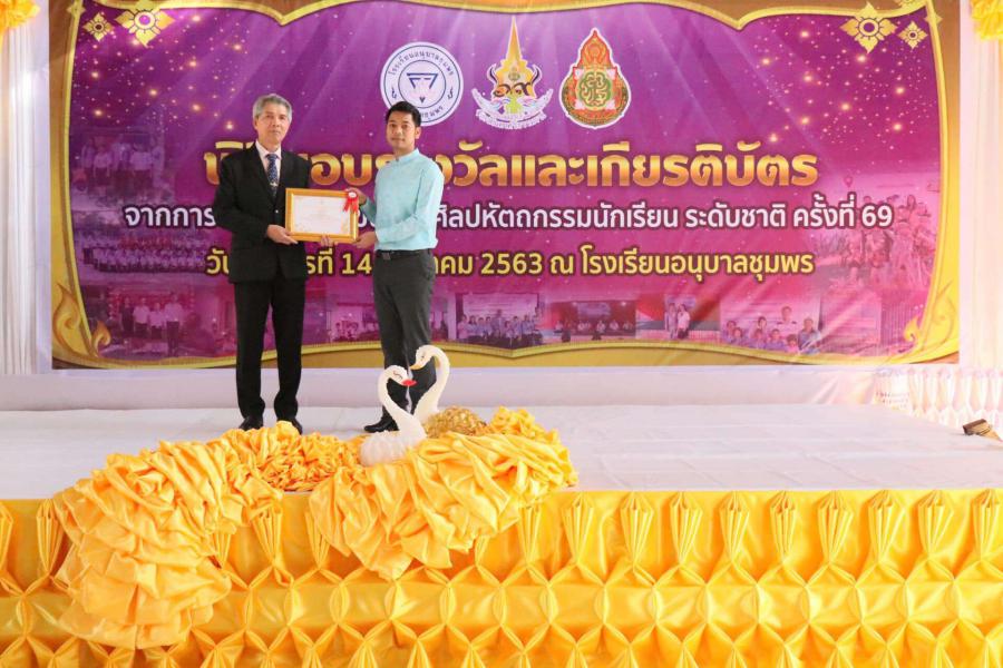 พิธีมอบเกียรติบัตร พร้อมทุนการศึกษานักเรียนที่ได้รับรางวัลในการแข่งขันงานศิลปหัตถกรรม นักเรียน (ระดับชาติ) ครั้งที่ 69 วันอังคารที่ 14 มกราคม 2563 ณ โดมใหญ่โรงเรียนอนุบาลชุมพร โดยมีนายมนูญ จันทร์สุข ผู้อำนวยการเขตพื้นที่การศึกษาประถมศึกษาชุมพรเขต 1 เป็นประธาน S:0