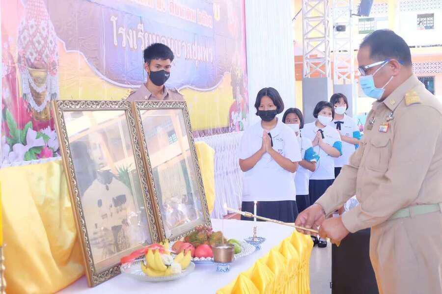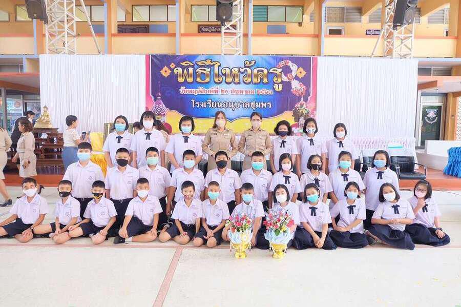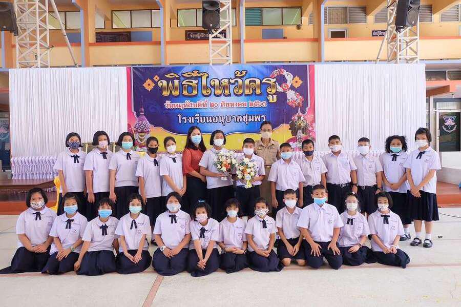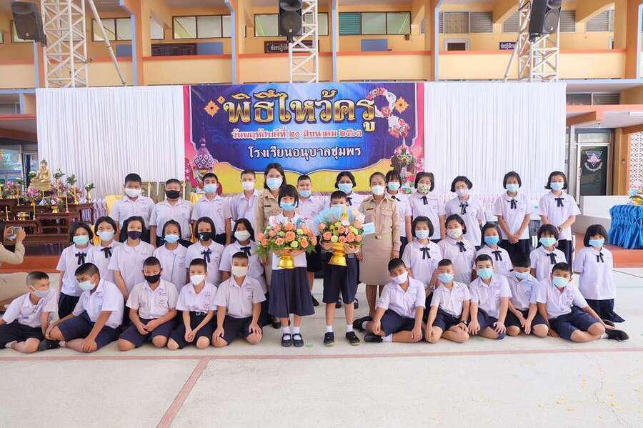 วันนี้ 20 สิงหาคม 2563 โรงเรียนอนุบาลชุมพร จัดพิธีไหว้ครู ประจำปีการศึกษา 2563 เพื่อให้นักเรียนแสดงออกถึงความเคารพรักและระลึกถึงพระคุณของบูรพาจารย์ นายศักดิ์สิทธิ์ แร่ทอง ผู้อำนวยการโรงเรียน เป็นประธานในพิธีจุดธูปเทียนบูชาพระรัตนตรัย เจิมหนังสือเพื่อเป็นสิริมงคล จากนั้นตัวแทนนักเรียนนำกล่าวบทสวดบูชาบูรพาจารย์ และกล่าวคำปฏิญาณตน ตัวแทนนักเรียนนำพานดอกไม้ พานเทียนธูปไหว้ครู เพื่อแสดงความเคารพ ปลูกฝังให้นักเรียนได้แสดงความกตัญญูกตเวทิตาต่อครูผู้ประสิทธิ์ประสาทวิชาความรู้เพื่อเทิดทูนประเพณีอันดีงามของไทย และมอบเกียรติบัตรให้แก่นักเรียนที่ร่วมประกวดทำพานไหว้ครู ณ บริเวณโดมใหญ่ โรงเรียนอนุบาลชุมพร S:0