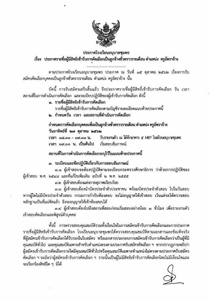 เรื่อง ประกาศรายชื่อผู้มีสิทธิ์เข้ารับการคัดเลือกเป็นลูกจ้างชั่วคราวรายเดือน ตำแหน่ง ครูอัตราจ้าง