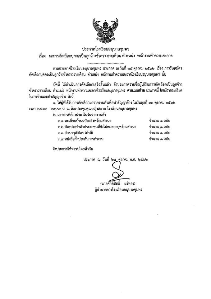 เรื่อง ผลการคัดเลือกบุคคลเป็นลูกจ้างชั่วคราวรายเดือน ตำแหน่ง พนักงานทำความสะอาด