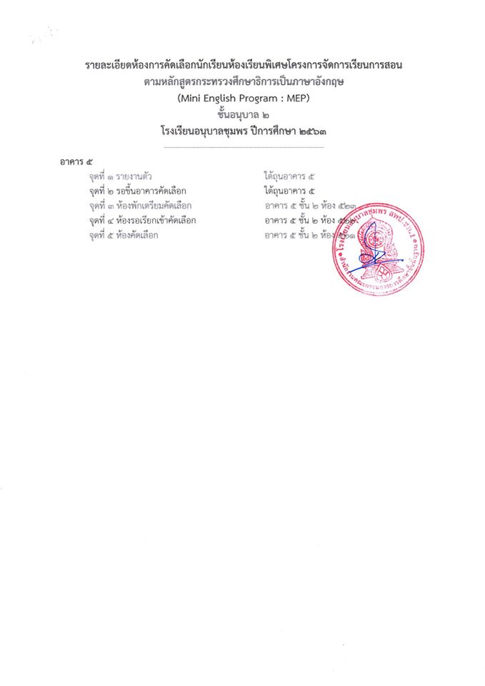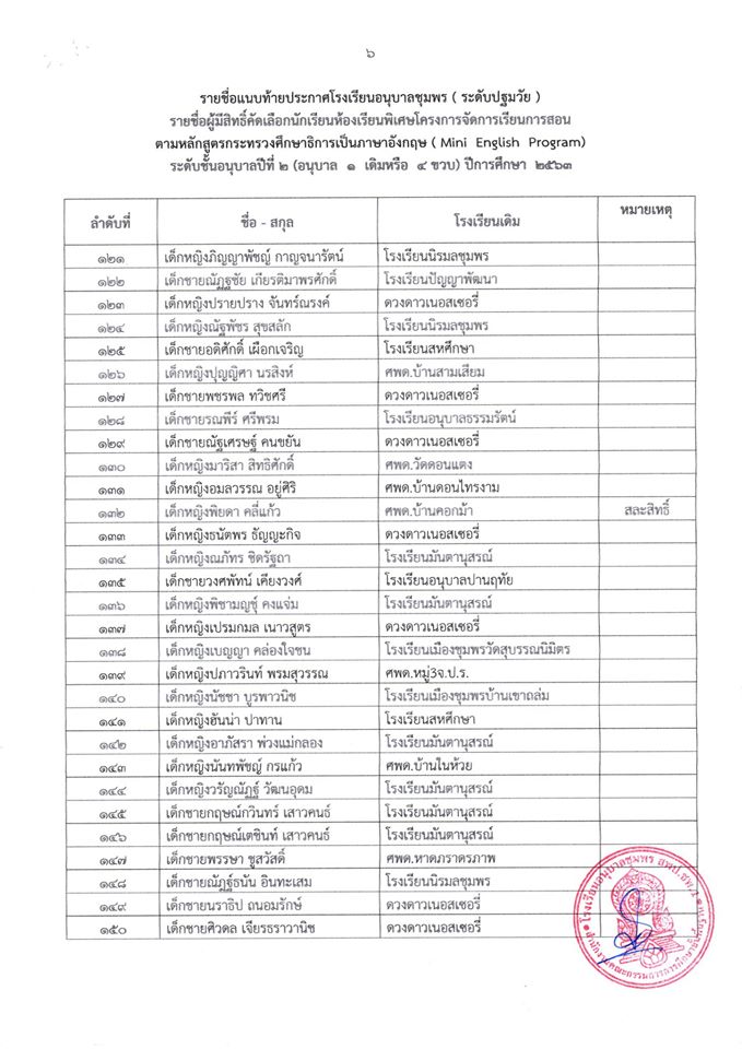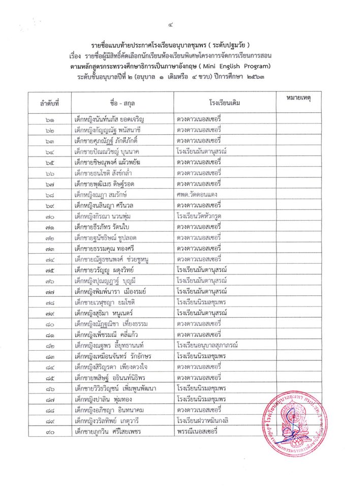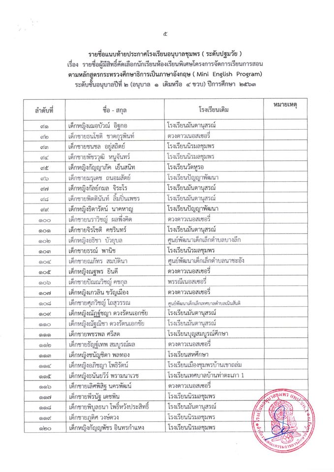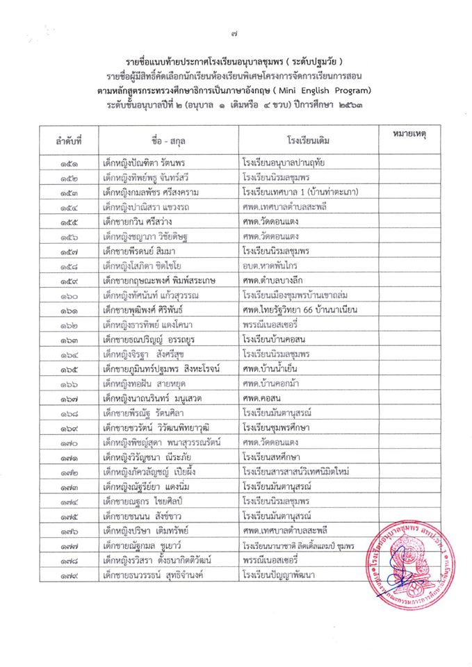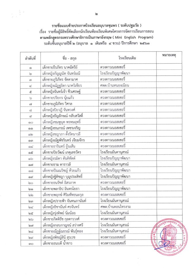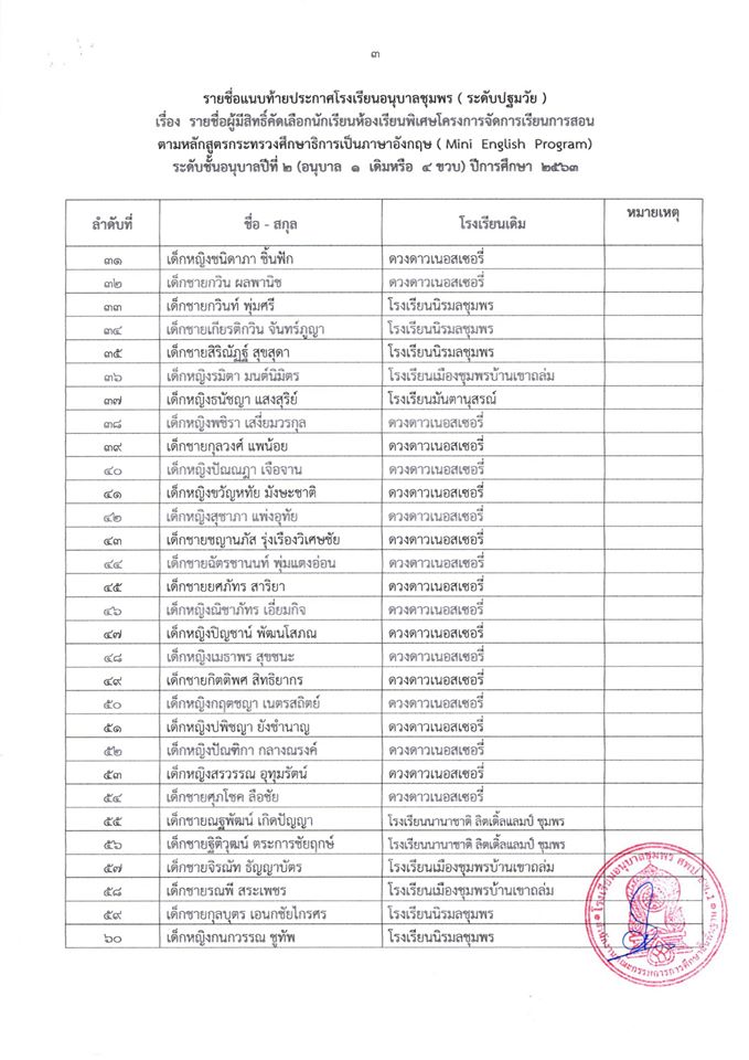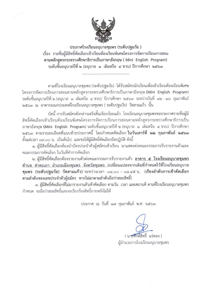 ประกาศ โรงเรียนอนุบาลชุมพร (ระดับปฐมวัย) เรื่อง รายชื่อนักเรียนผู้มีสิทธิ์เข้ารับการคัดเลือกเข้าเรียนห้องเรียนพิเศษโครงการ (Mini English Program) ระดับชั้นอนุบาลปีที่ 2 (อนุบาล 1 เดิมหรือ 4 ขวบ) ปีกา