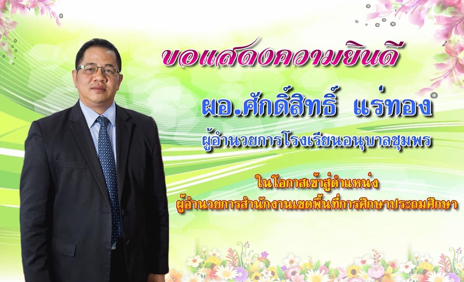 คณะกรรมการสถานศึกษา ครู บุคลากรทางการศึกษา และนักเรียนโรงเรียนอนุบาลชุมพร ขอแสดงความยินดีกับท่านผู้อำนวยการศักดิ์สิทธิ์ แร่ทอง ผู้อำนวยการโรงเรียนอนุบาลชุมพร ในโอกาสเข้ารับตำแหน่งผู้อำนวยการสำนักงานเขตพื้นที่การศึกษาประถมศึกษา