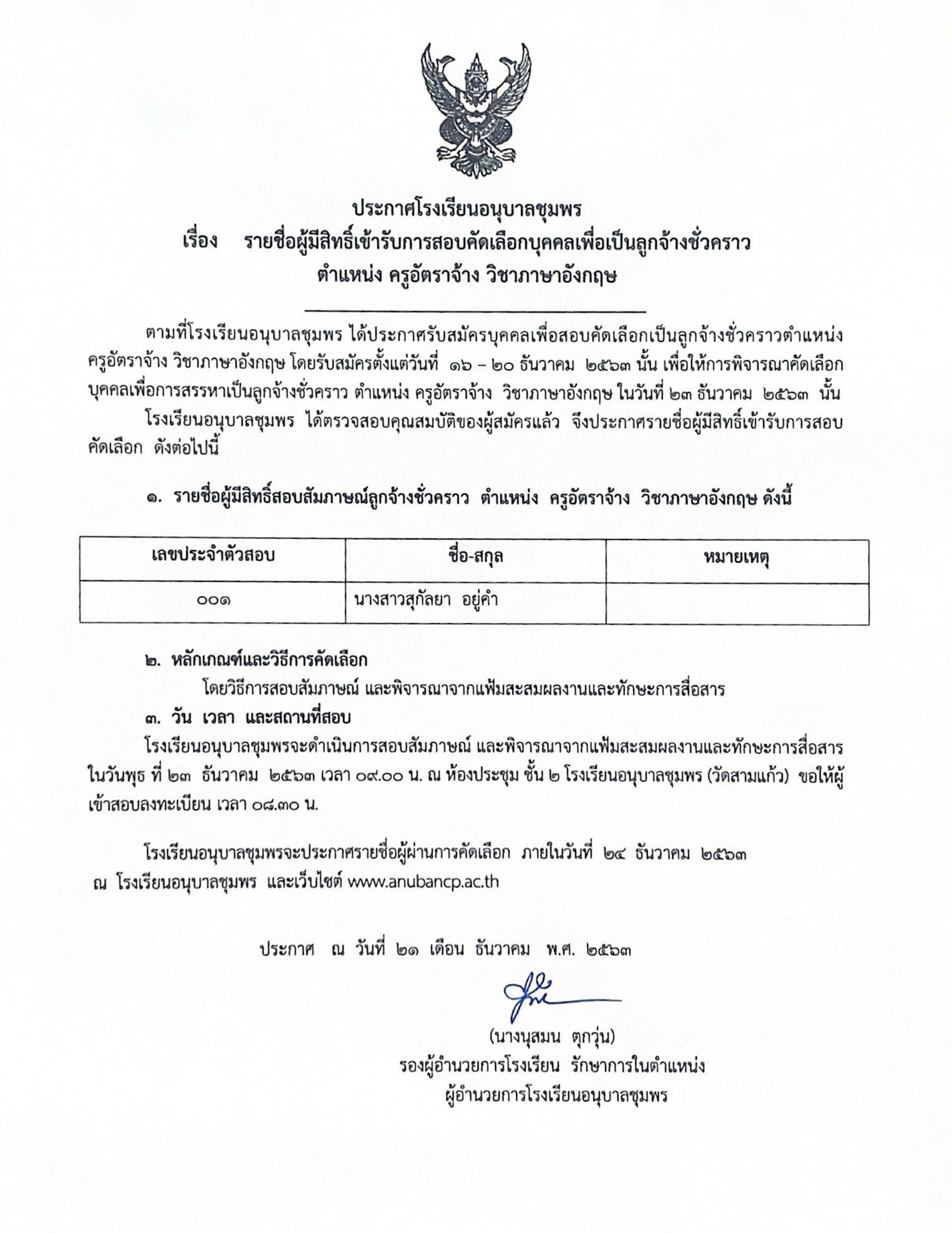 ประกาศโรงเรียนอนุบาลชุมพร เรื่อง รายชื่อผู้มีสิทธิ์เข้ารับการสอบคัดเลือกบุคคลเพื่อเป็นลูกจ้างชั่วคราว ตำแหน่ง ครูอัตราจ้าง วิชาภาษาอังกฤษ