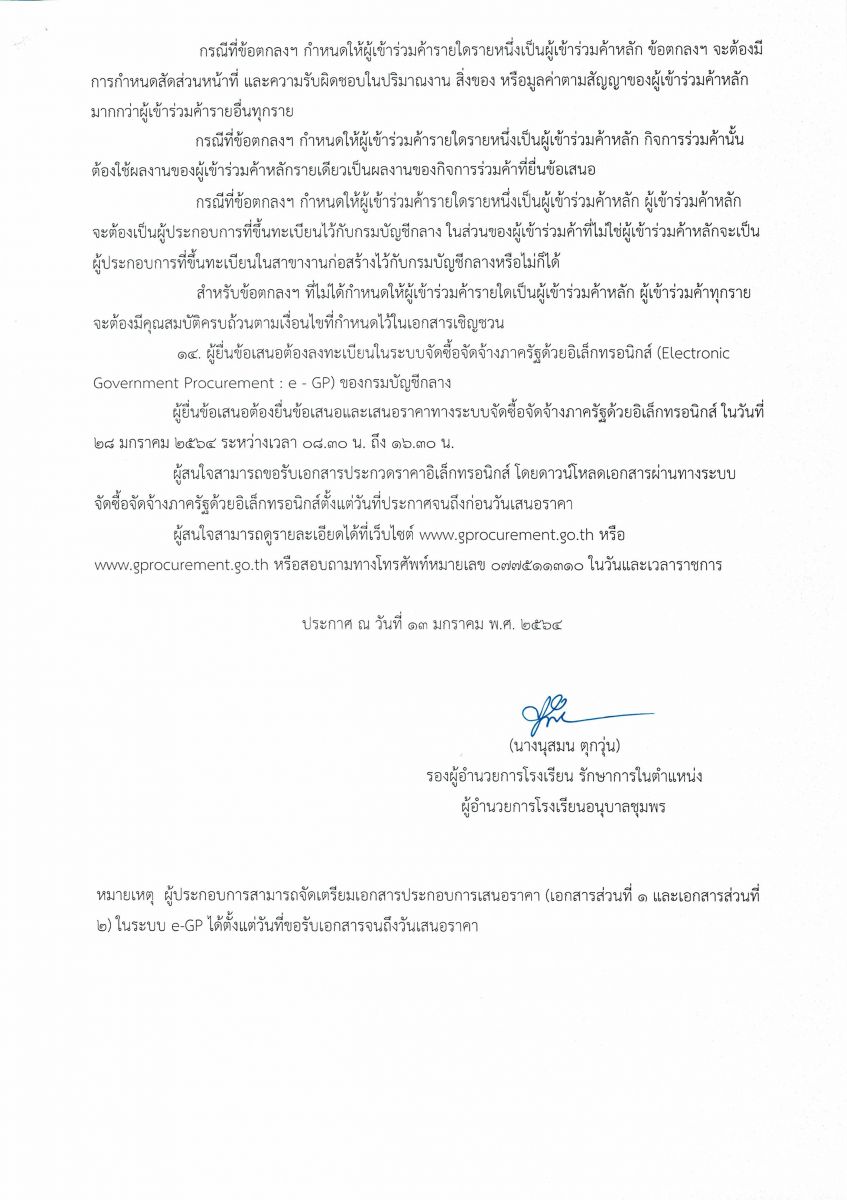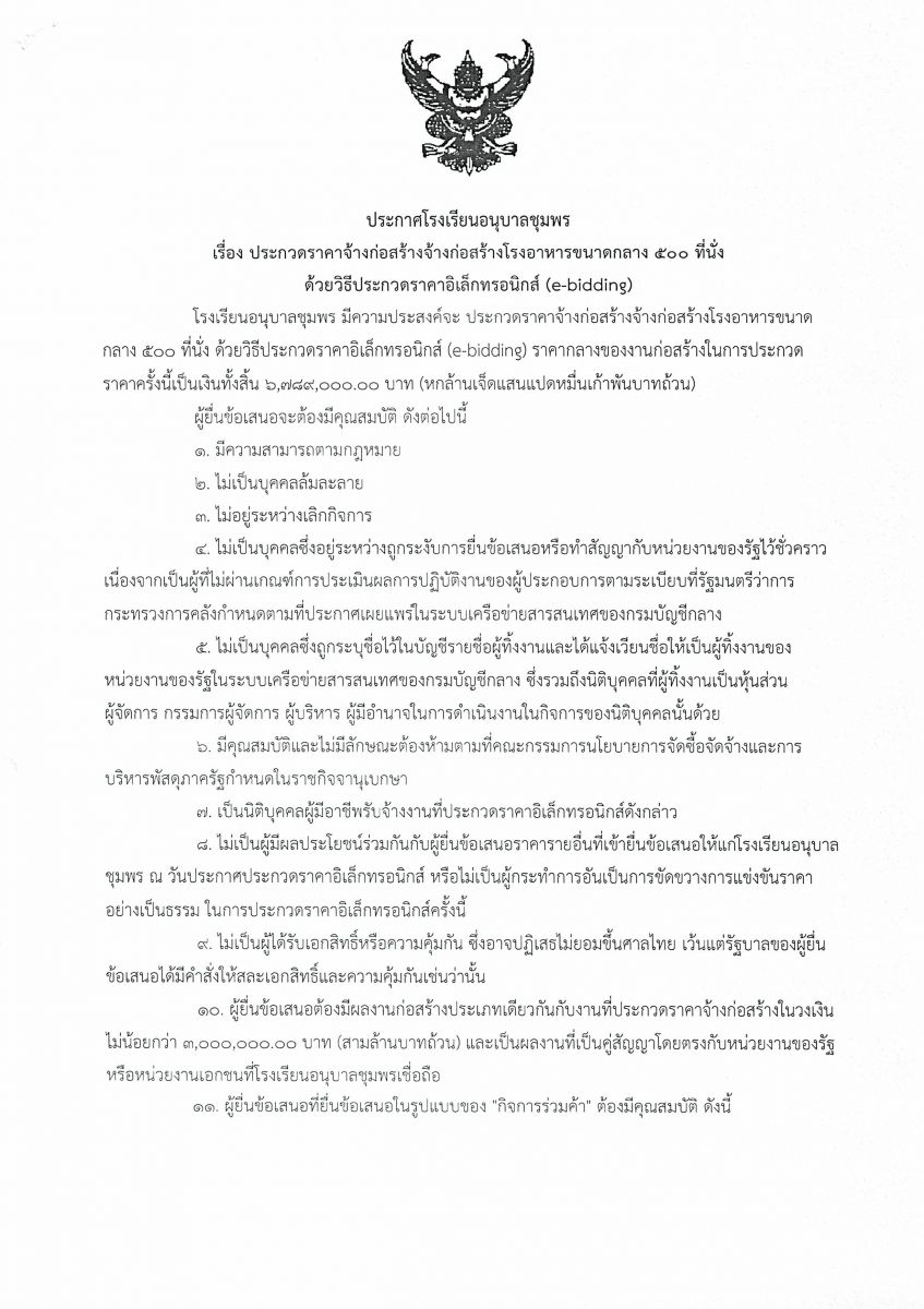 ประกาศโรงเรียนอนุบาลชุมพร เรื่อง ประกวดราคาจ้างก่อสร้างโรงอาหารขนาดกลาง ๕๐๐ ที่นั่ง ด้วยวิธีประกวดราคาอิเล็กทรอนิกส์ (e-bidding)