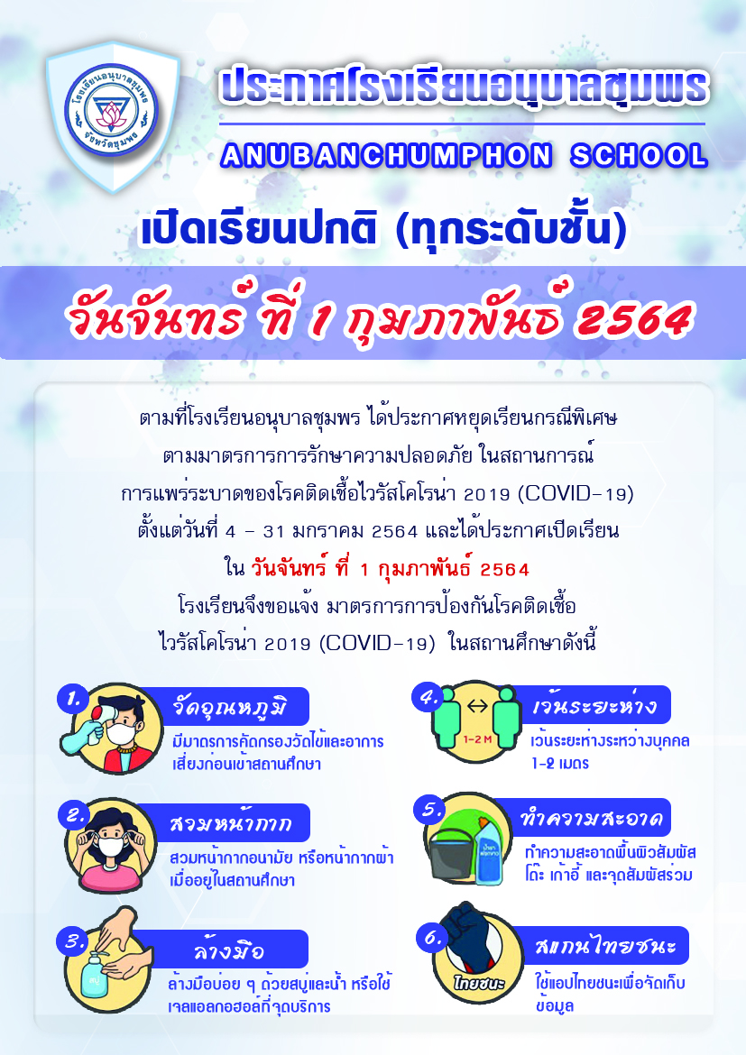ประกาศโรงเรียนอนุบาลชุมพร เนื่องในวันจันทร์ ที่ 1 กุมภาพันธุ์ 2564 โรงเรียนอนุบาลชุมพรได้มีการเปิด เรียนตามประกาศของกระทรวงศึกษาธิการ โรงเรียนอนุบาลชุมพรจึงขอแจ้งมาตรการการป้องกันโรค ติดเชื้อไวรัสโคโ