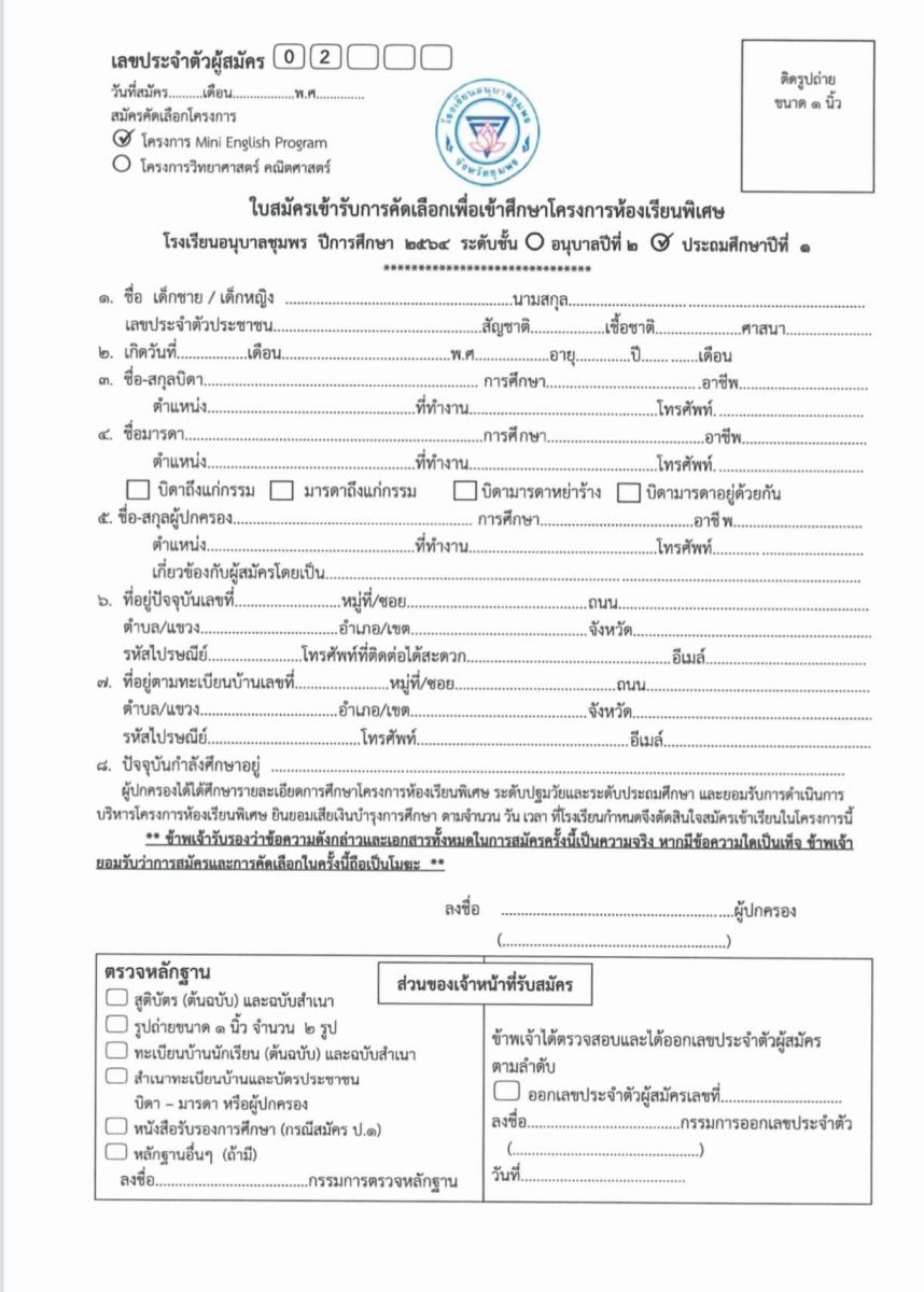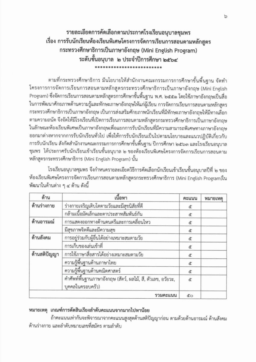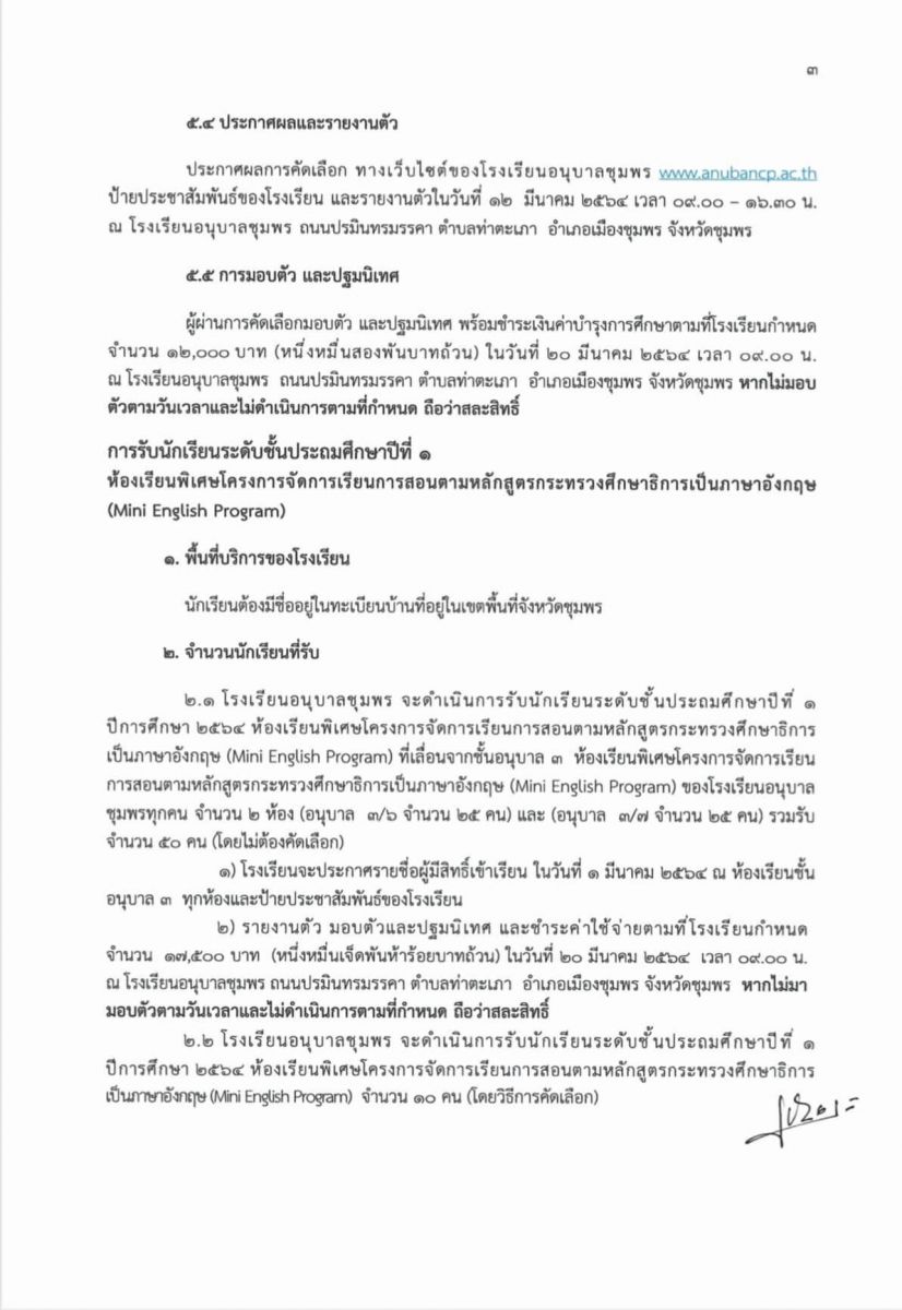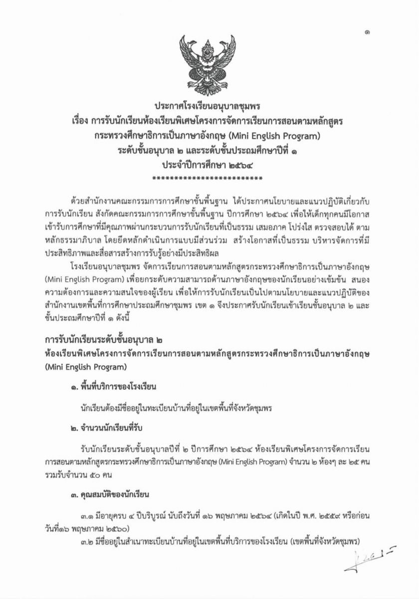 ประกาศโรงเรียนอนุบาลชุมพร เรื่อง การรับนักเรียนห้องเรียนพิเศษโครงการจัดการเรียนการสอนตามหลักสูตรกระทรวงศึกษาธิการเป็นภาษาอังกฤษ (Mini English Program) ระดับชั้นอนุบาล 2 และระดับชั้นประถมศึกษาปีที่ 1