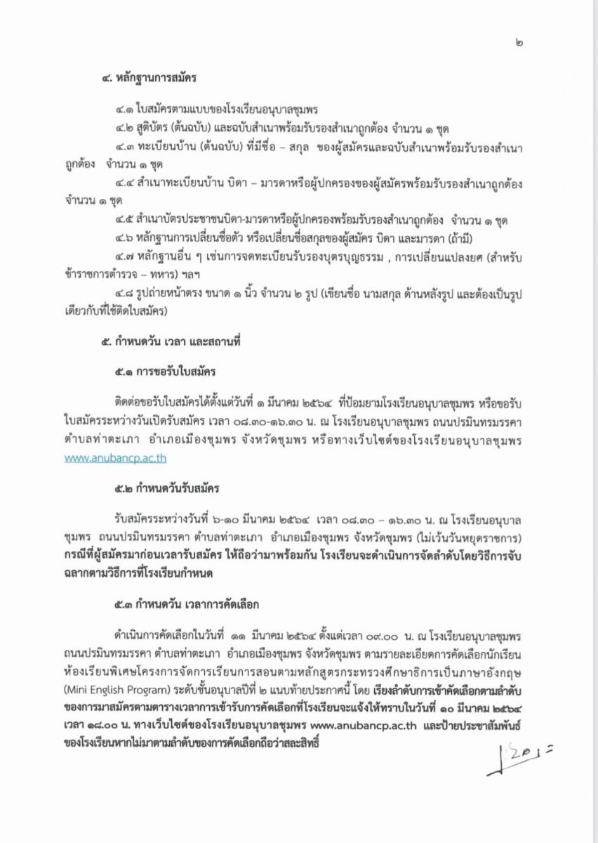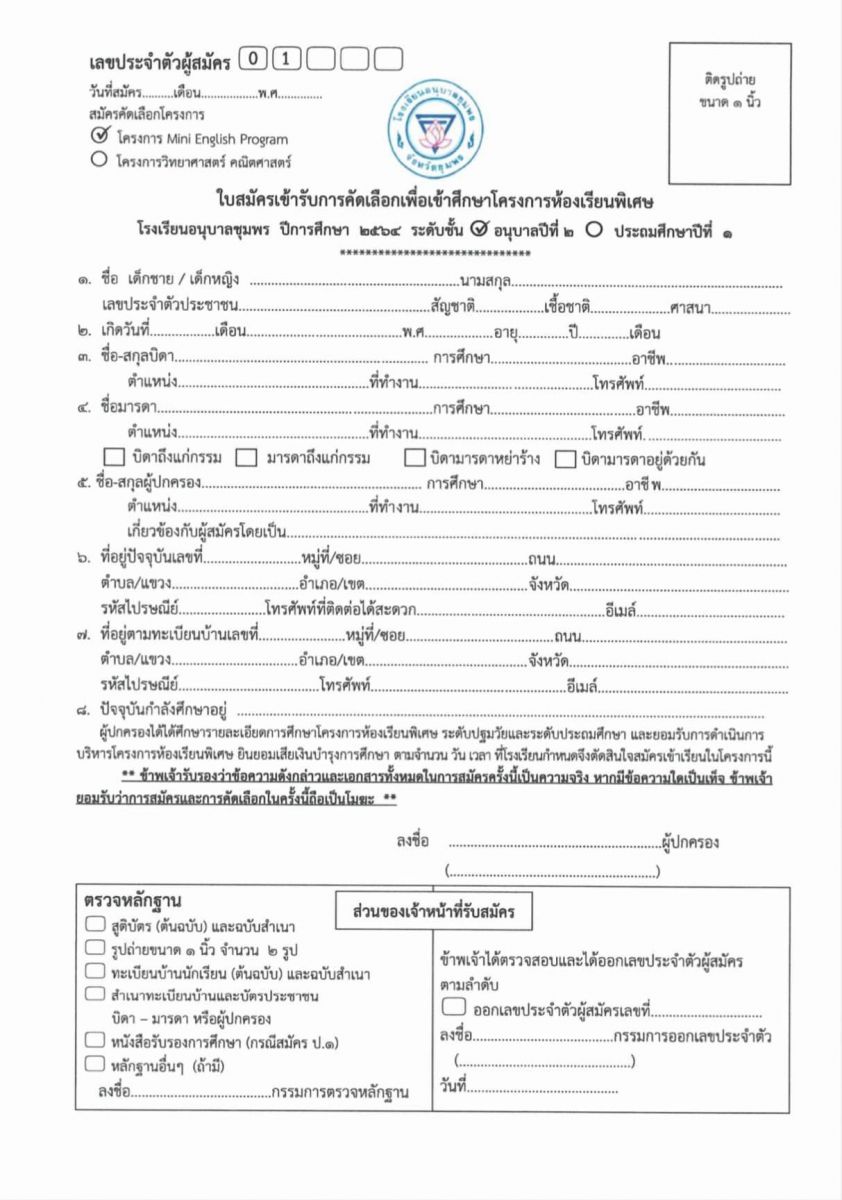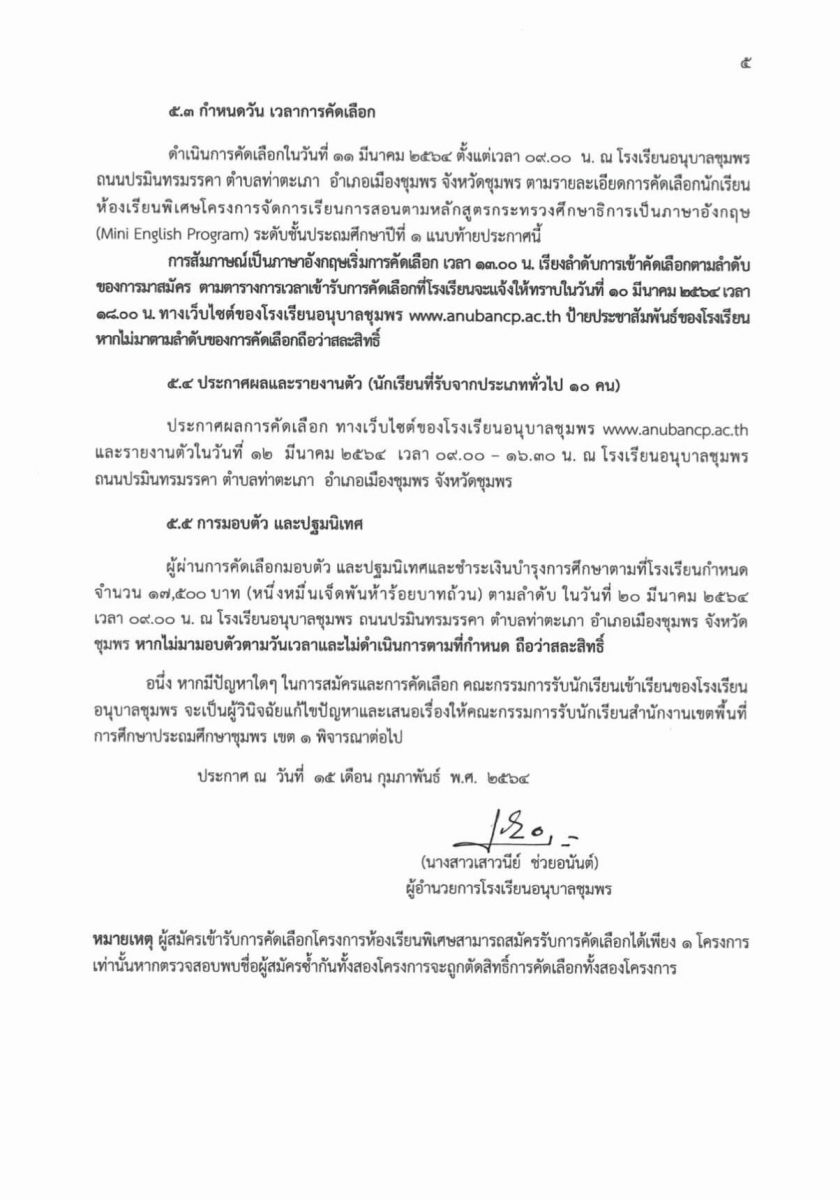 ประกาศโรงเรียนอนุบาลชุมพร เรื่อง การรับนักเรียนห้องเรียนพิเศษโครงการจัดการเรียนการสอนตามหลักสูตรกระทรวงศึกษาธิการเป็นภาษาอังกฤษ (Mini English Program) ระดับชั้นอนุบาล 2 และระดับชั้นประถมศึกษาปีที่ 1
