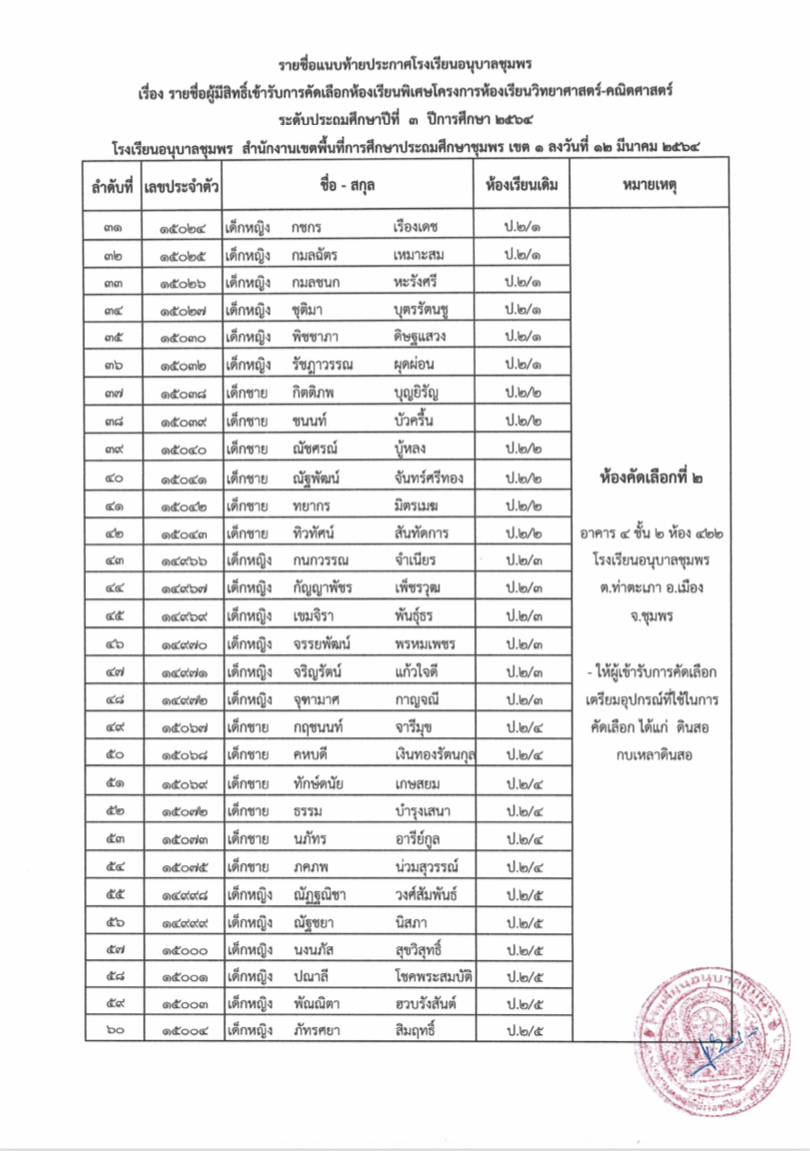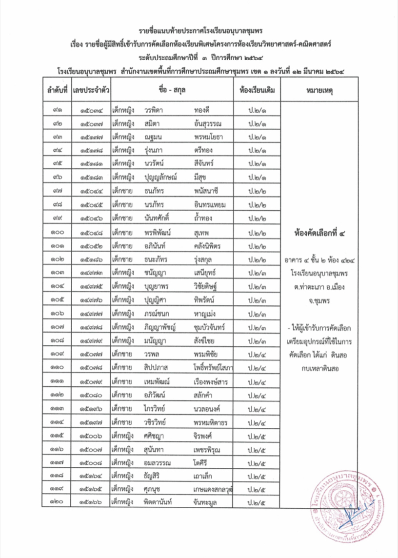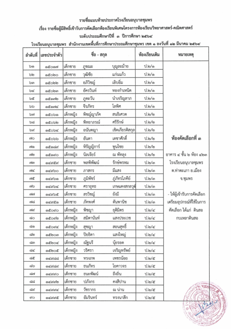ประกาศโรงเรียนอนุบาลชุมพร เรื่อง รายชื่อนักเรียนผู้มีสิทธิ์เข้ารับการคัดเลือกเข้าเรียนห้องเรียนพิเศษโครงการ วิทยาศาสตร์-คณิตศาสตร์ ระดับชั้นประถมศึกษาปีที่ 3 ปีการศึกษา 2564