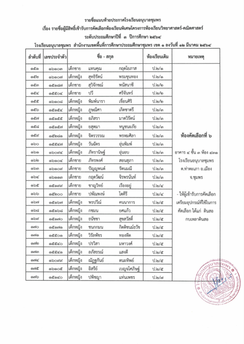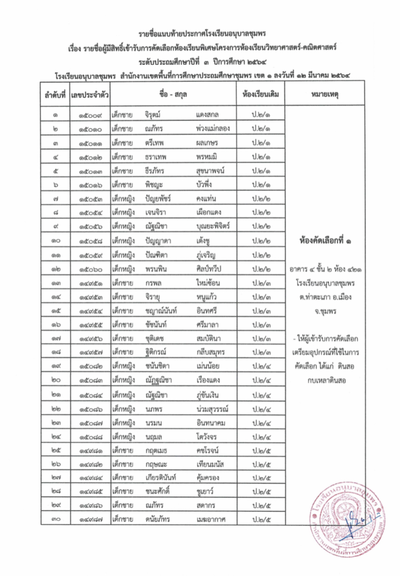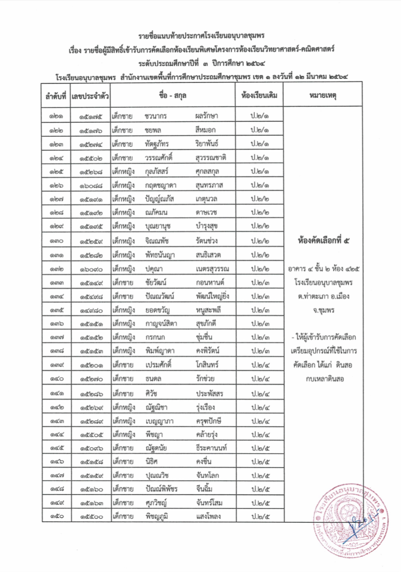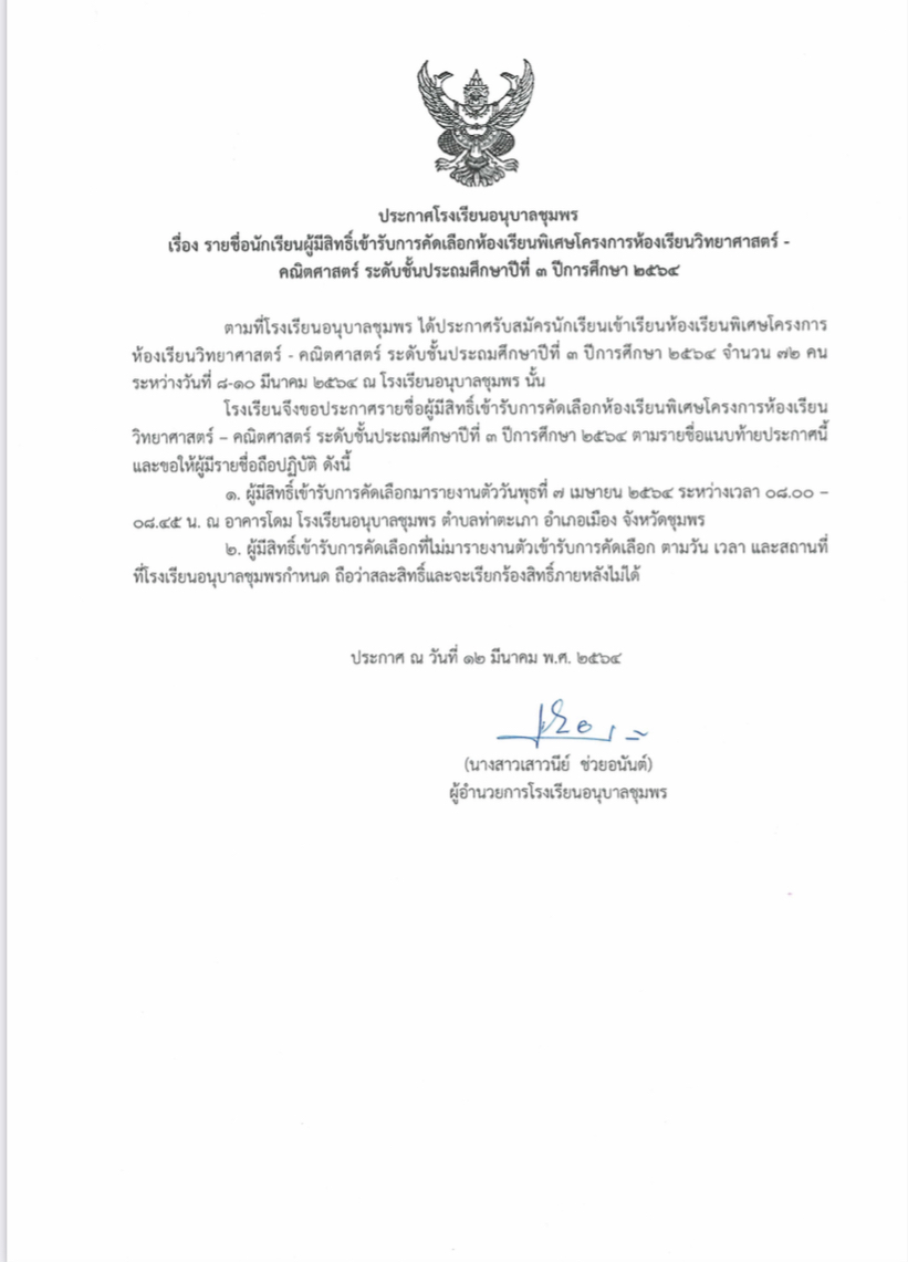 ประกาศโรงเรียนอนุบาลชุมพร เรื่อง รายชื่อนักเรียนผู้มีสิทธิ์เข้ารับการคัดเลือกเข้าเรียนห้องเรียนพิเศษโครงการ วิทยาศาสตร์-คณิตศาสตร์ ระดับชั้นประถมศึกษาปีที่ 3 ปีการศึกษา 2564