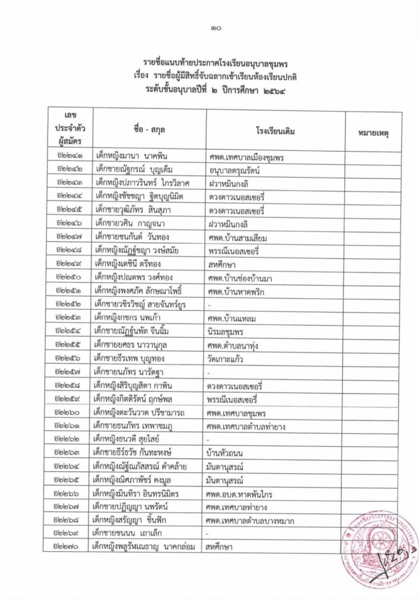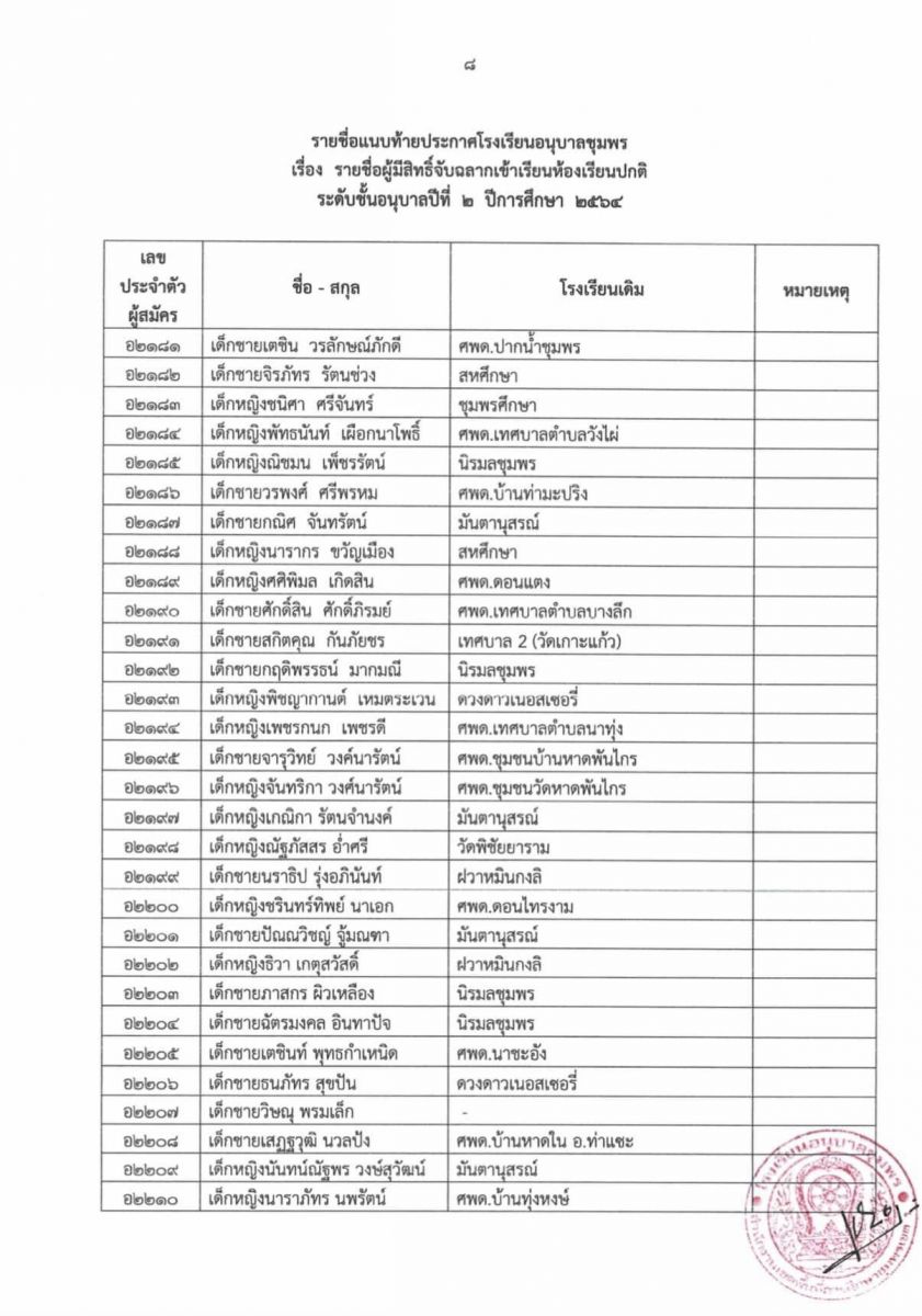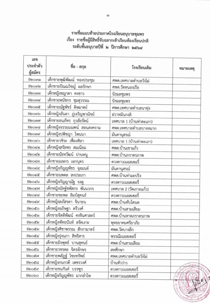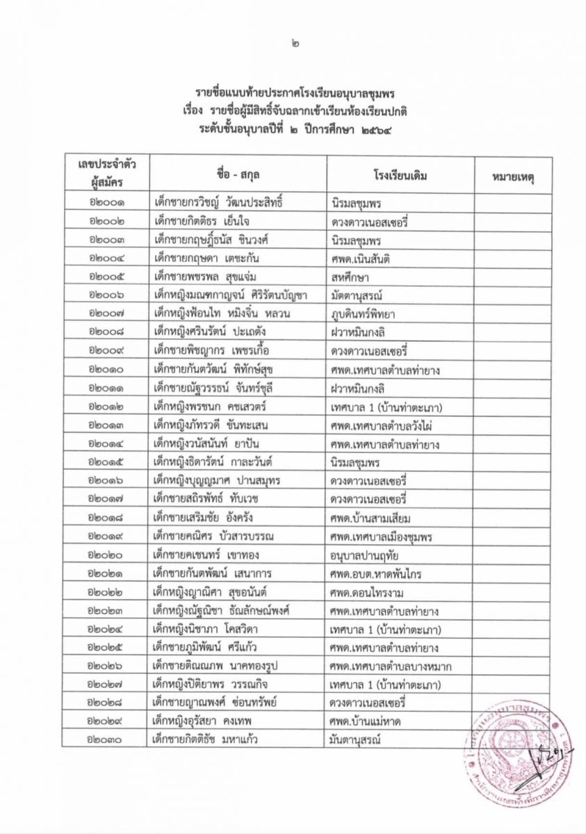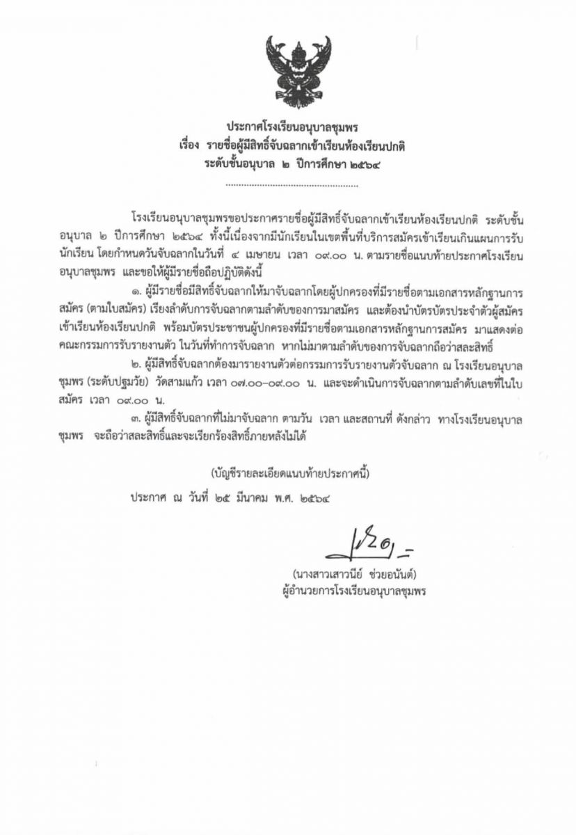 ประกาศโรงเรียนอนุบาลชุมพร เรื่อง รายชื่อผู้มีสิทธิ์จับฉลากเข้าเรียนห้องเรียนปกติ ระดับชั้นอนุบาล 2 ปีการศึกษา 2564