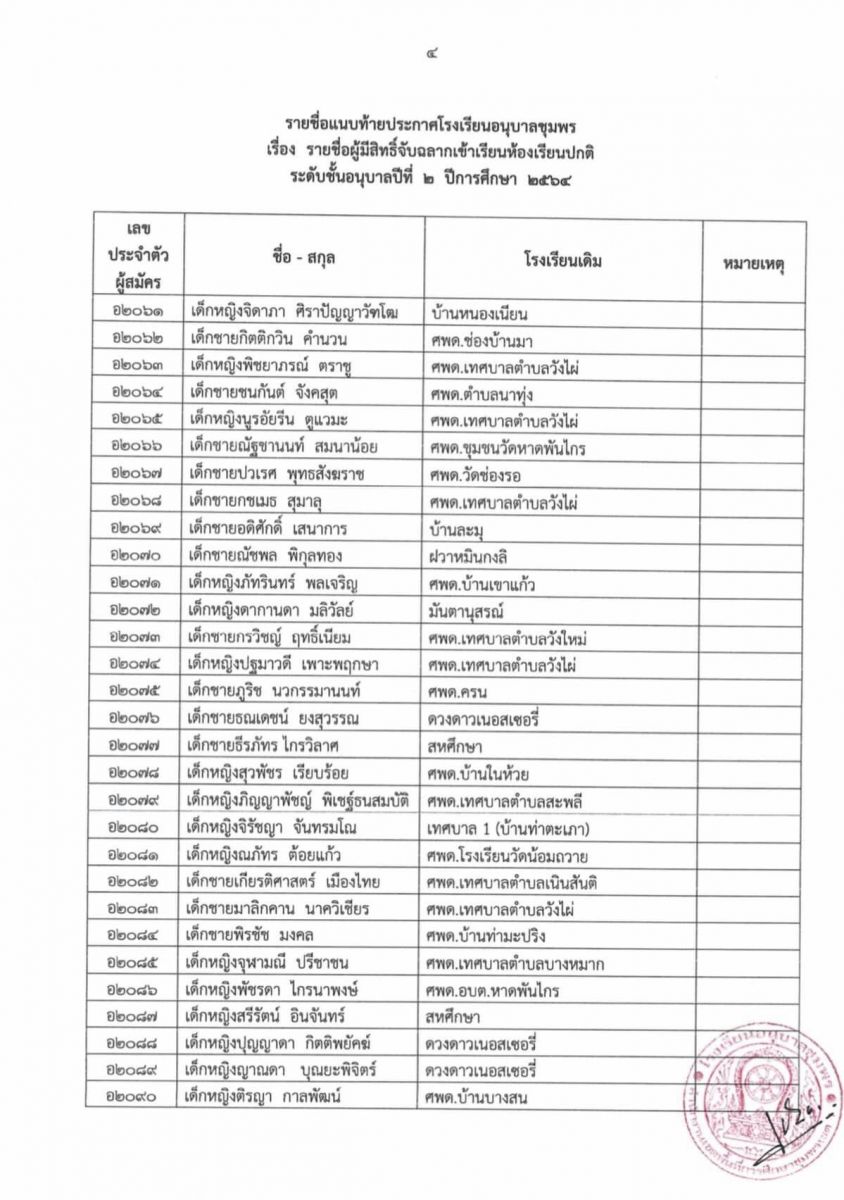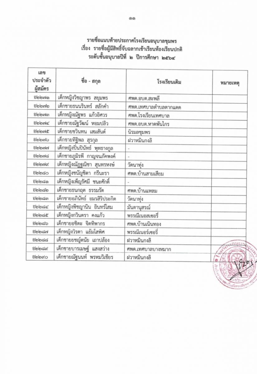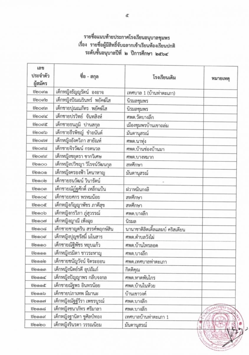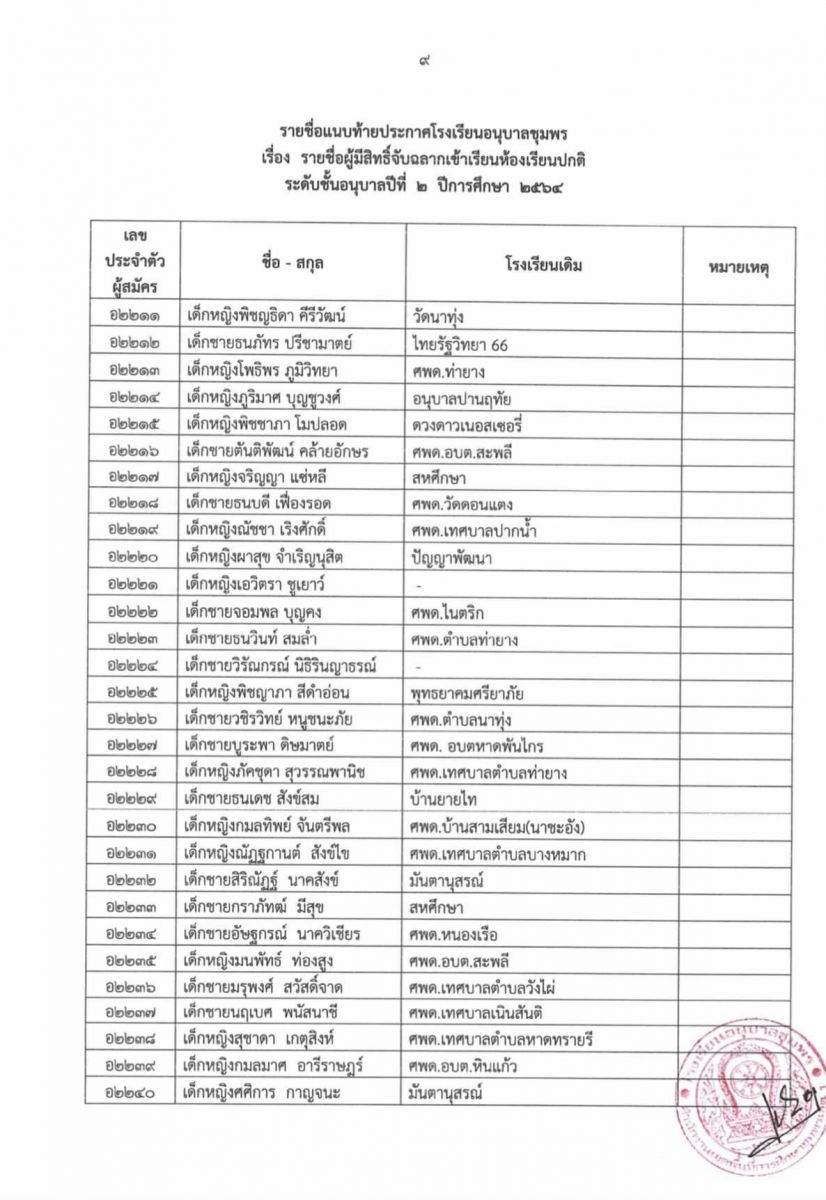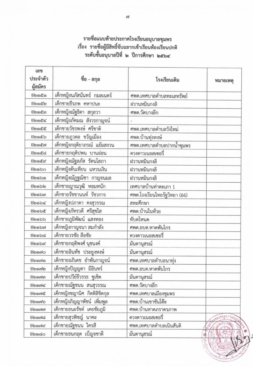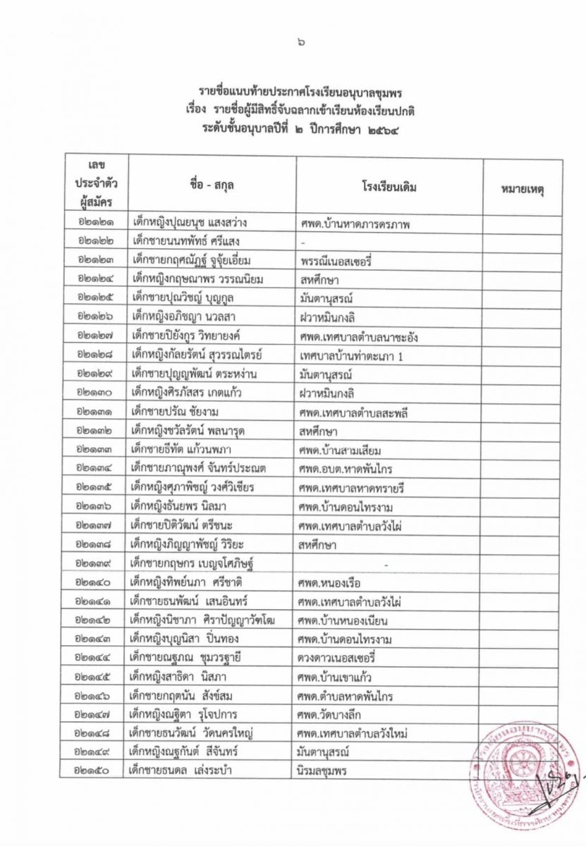ประกาศโรงเรียนอนุบาลชุมพร เรื่อง รายชื่อผู้มีสิทธิ์จับฉลากเข้าเรียนห้องเรียนปกติ ระดับชั้นอนุบาล 2 ปีการศึกษา 2564