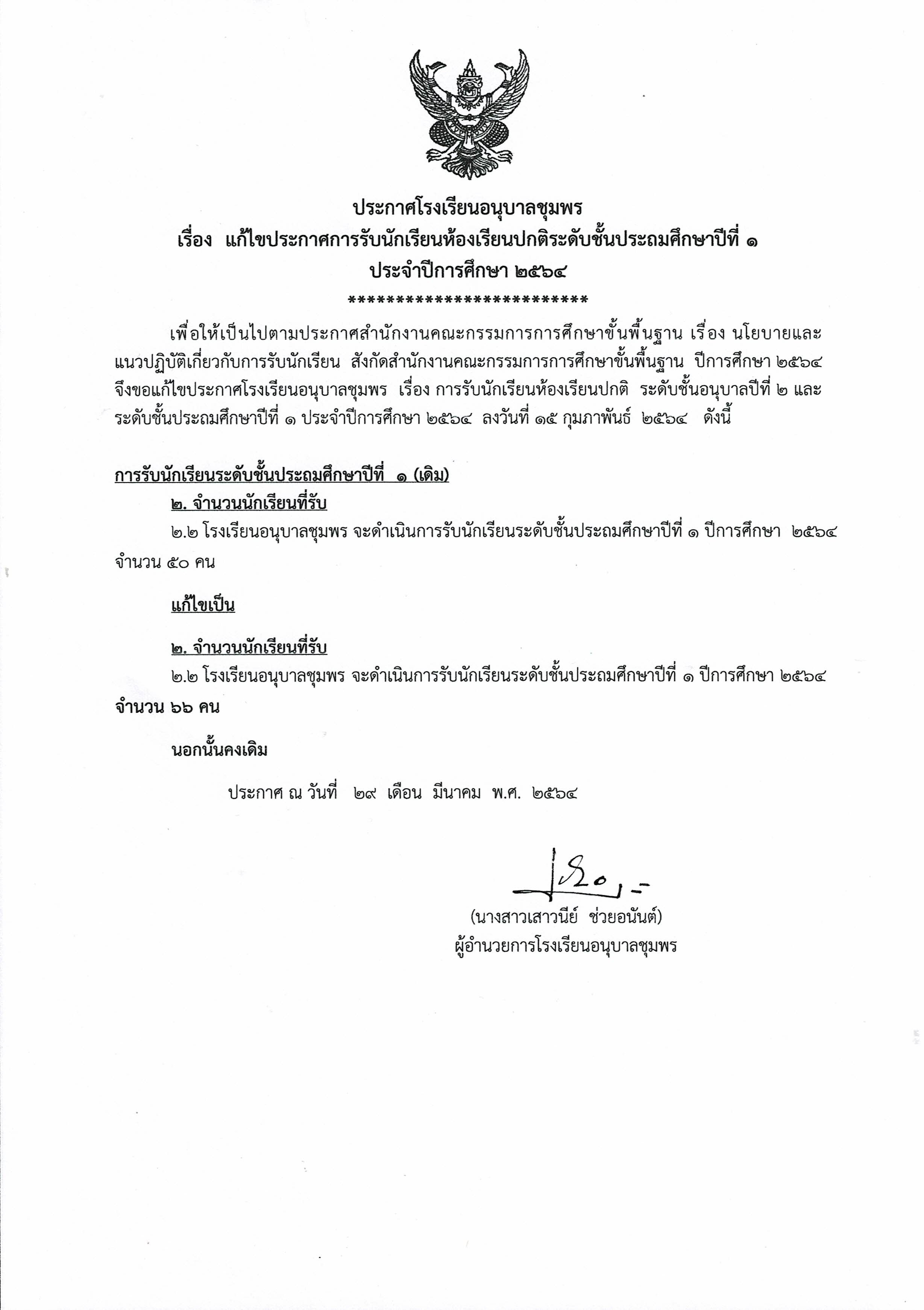 ประกาศโรงเรียนอนุบาลชุมพร เรื่อง แก้ไขประกาศการรับนักเรียนห้องเรียนปกติระดับชั้นประถมศึกษาปีที่ ๑ ประจำปีการศึกษา ๒๕๖๔