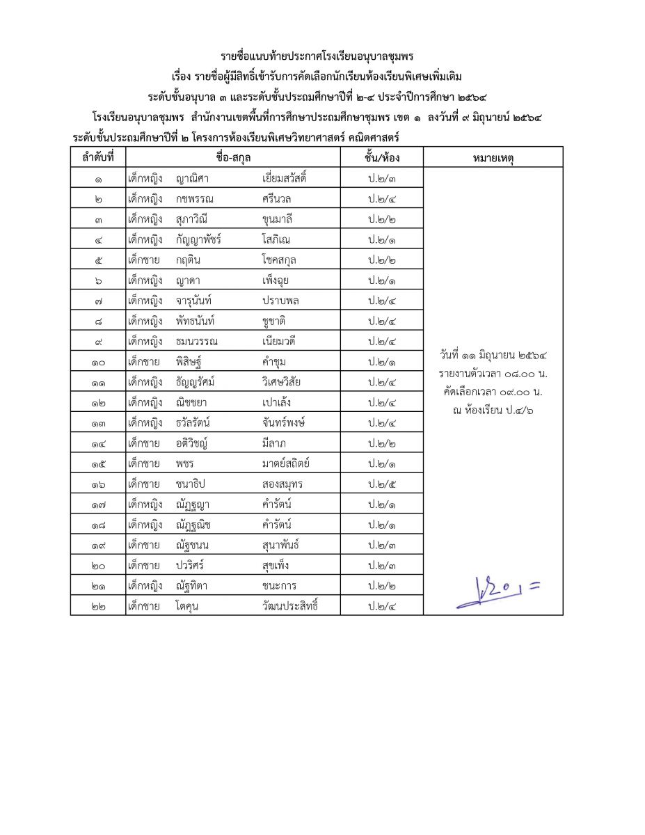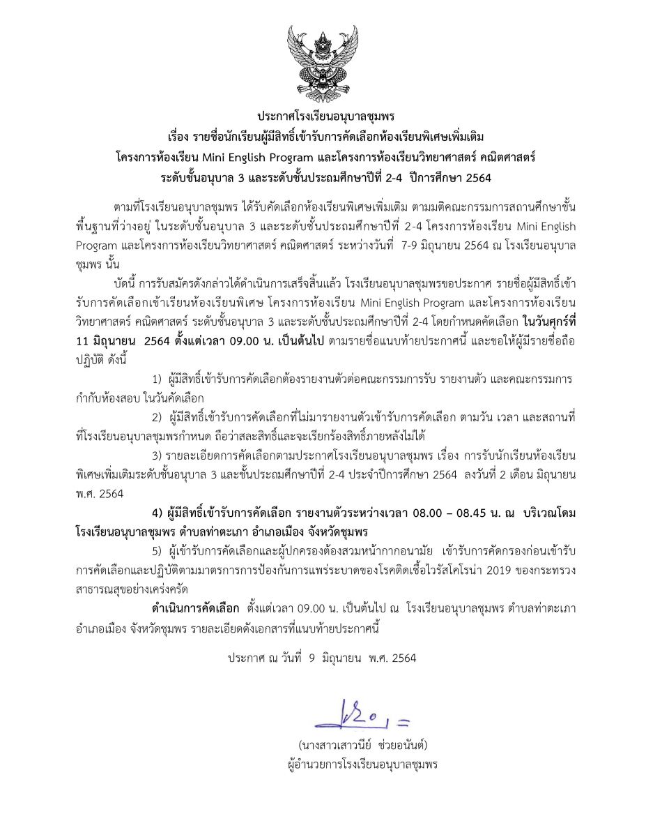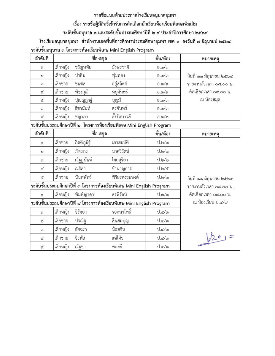 ประกาศโรงเรียนอนุบาลชุมพร เรื่อง รายชื่อนักเรียนผู้มีสิทธิ์เข้ารับการคัดเลือกห้องเรียนพิเศษเพิ่มเติม โครงการห้องเรียน Mini English Program และโครงการห้องเรียนวิทยาศาสตร์ คณิตศาสตร์ ระดับชั้นอนุบาล 3 แ