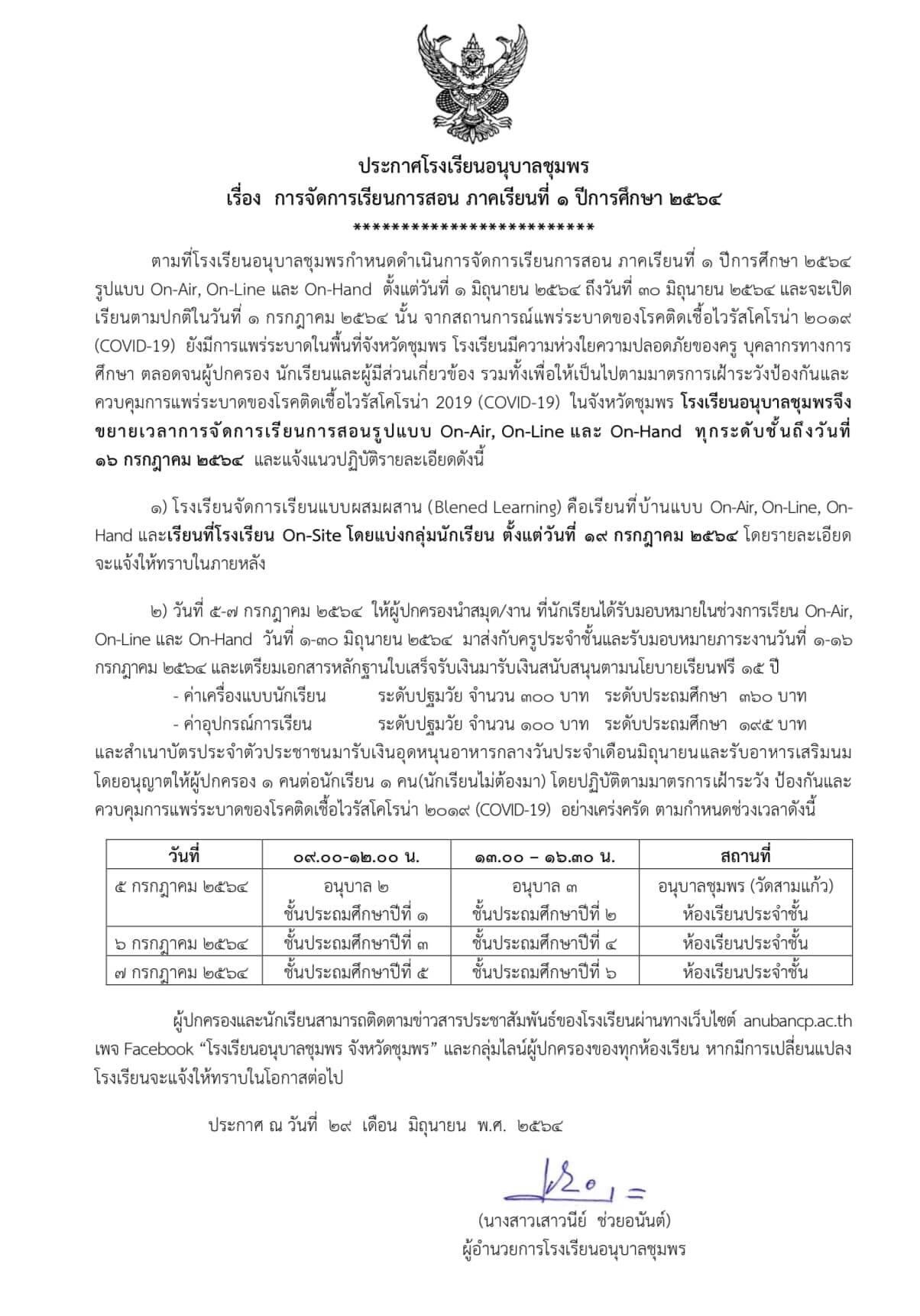ประกาศ โรงเรียนอนุบาลชุมพร เรื่อง การจัดการเรียนการสอน ภาคเรียนที่ 1 ปีการศึกษา 2564