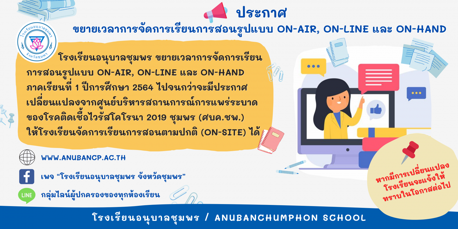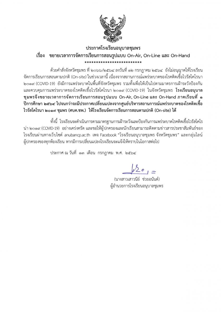 ประกาศโรงเรียนอนุบาลชุมพร เรื่อง ขยายเวลาการจัดการเรียนการสอนรูปแบบ On-Air, On-Line และ On-Hand